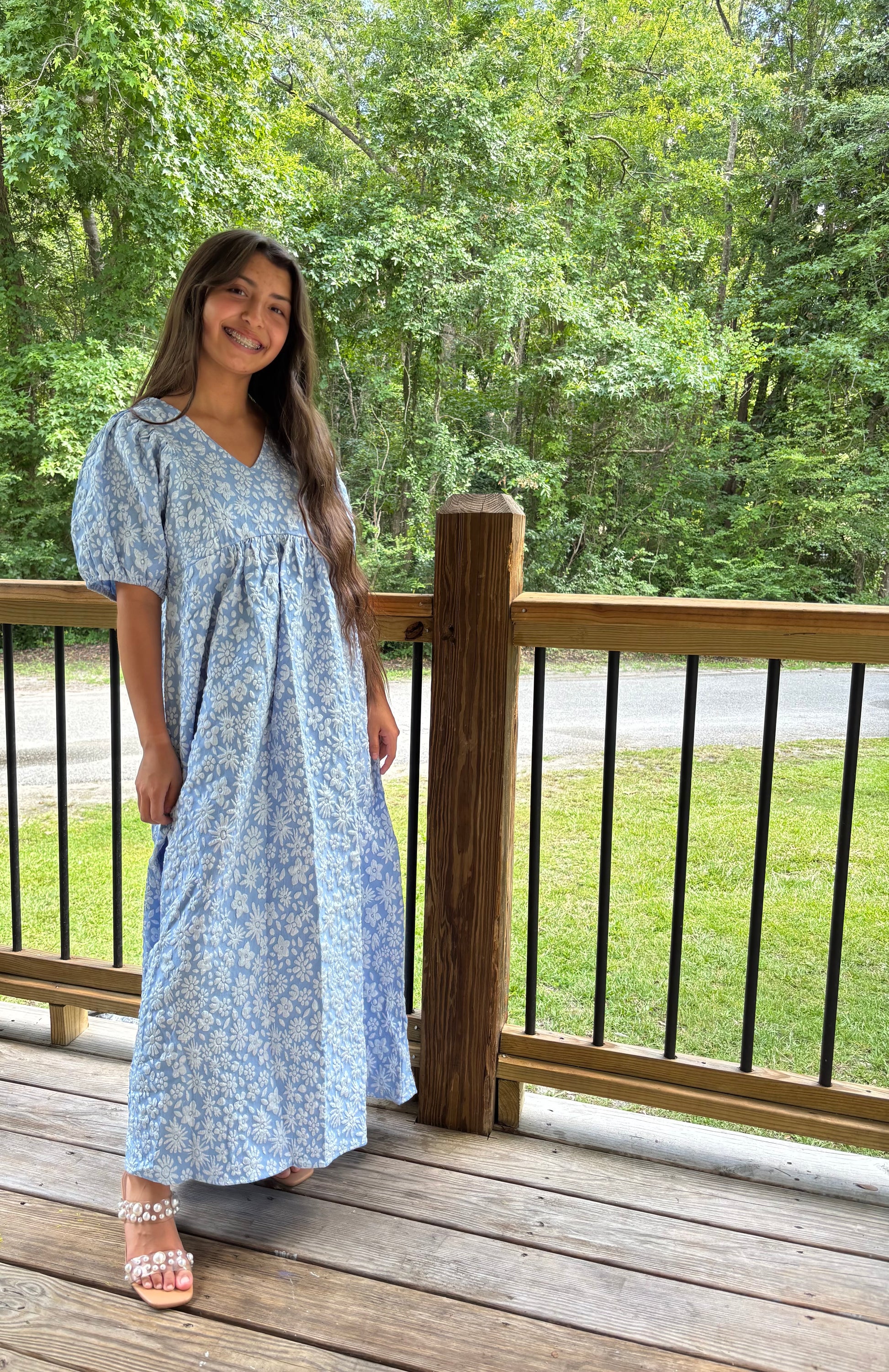 Effortlessly chic, this floral textured midi dress is a must-have for your wardrobe. Designed with delicate puff sleeves and a soft, feminine silhouette, it flatters in all the right places. Crafted from 100% polyester, the fabric features a beautiful textured floral pattern that adds dimension and charm. The midi length makes it perfect for both daytime events and evening occasions.